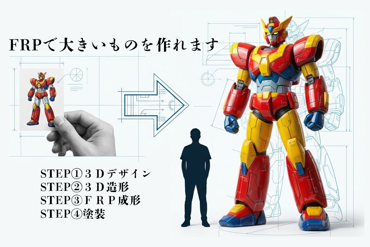 | FRP成形 | 原型または生産型を使用して、FRPで成形します。 FRPには様々な製造方法があるため、用途、形状、数量などによって方法を選択します。 3D大型立体造形サービスでは、ハンドレイアップ成形にて造形を行う場合が多いです。 |